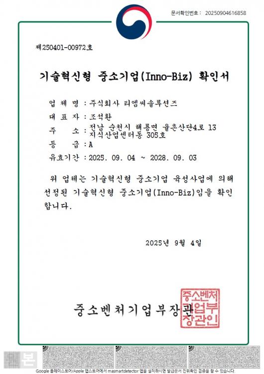 [Àü³²Å×Å©³ëÆÄÅ©/»çȸ]¹®±Ù¹Ì ±âÀÚ = ¿¡³ÊÁö AI ¼Ö·ç¼Ç Àü¹®±â¾÷ ¢ßƼ¿¥¾¾¼Ö·ç¼ÇÁî(´ëÇ¥ Á¶¼®È¯)´Â ±â¼úÇõ½ÅÇü Áß¼Ò±â¾÷ ÀÎÁõÁ¦µµÀÎ ¡®À̳ëºñÁî(Inno-Biz) Aµî±Þ¡¯ ÀÎÁõÀ» ȹµæÇß´Ù°í ¹àÇû´Ù. À̹ø ÀÎÁõÀº À̳ëºñÁî Æò°¡ ü°è¿¡¼ »óÀ§ ¼öÁØ¿¡ ÇØ´çÇÏ´Â µî±ÞÀ¸·Î, ±â¾÷ÀÇ ±â¼ú°æÀï·Â°ú ¼ºÀå °¡´É¼ºÀ» ±¹°¡ÀûÀ¸·Î °øÀιÞÀº ¼º°ú´Ù.