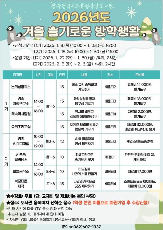 [±¤ÁÖ/±³À°]¹®±Ù¹Ì ±âÀÚ = ±¤Áֽñ³À°Ã»Áß¾Óµµ¼°ü(ÀÌÇÏ ±¤ÁÖÁß¾Óµµ¼°ü)Àº °Ü¿ï¹æÇÐÀ» ¸Â¾Æ ¿À´Â 27ÀϺÎÅÍ 2¿ù 6ÀϱîÁö ÃʵîÇлýÀ» ´ë»óÀ¸·Î ¡®°Ü¿ï ½½±â·Î¿î ¹æÇлýȰ¡¯À» ¿î¿µÇÑ´Ù.