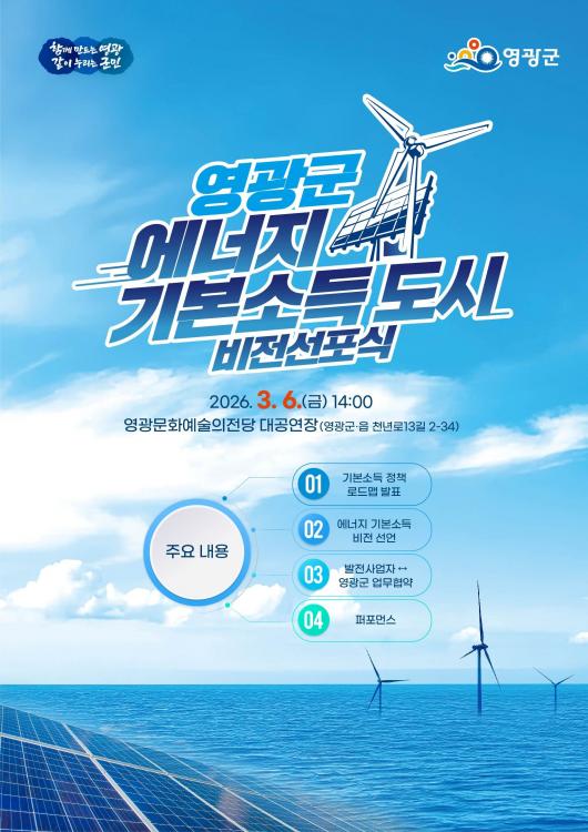 ±ºÀº 2026³â 3¿ù 6ÀÏ(±Ý) ¿ÀÈÄ 2½Ã, ¿µ±¤¹®È¿¹¼úÀÇÀü´ç ´ë°ø¿¬Àå¿¡¼ ¡¸¿µ±¤±º ¿¡³ÊÁö ±âº»¼Òµæ µµ½Ã ºñÀü¼±Æ÷½Ä¡¹À» °³ÃÖÇÑ´Ù°í ¹àÇû´Ù.