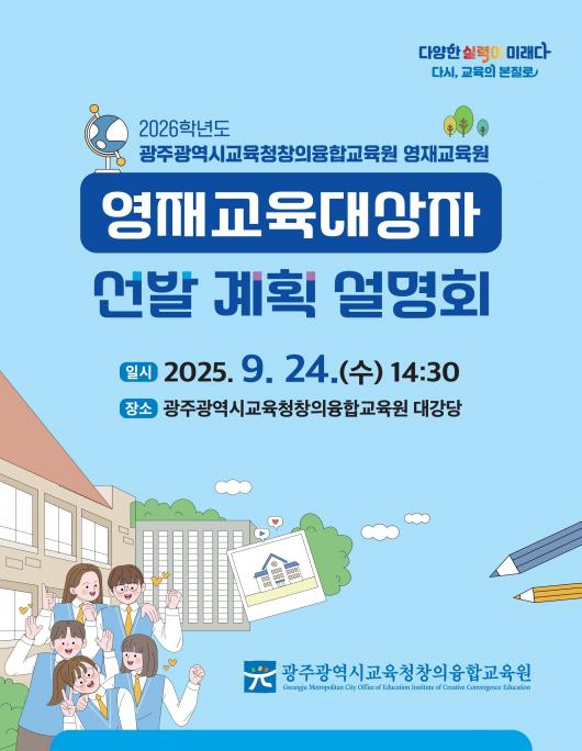 ±¤ÁÖâÀÇÀ¶ÇÕ±³À°¿ø Áø¿µ ¿øÀåÀº ¡°¼³¸íȸ¸¦ ÅëÇØ Çб³ ÇöÀåÀÇ ¿µÀç±³À° ´ã´çÀÚµéÀÌ ¼±¹ß ÀüÇü°ú ¿î¿µ °èȹÀ» ¸íÈ®È÷ ÀÌÇØÇÏ±æ ±â´ëÇÑ´Ù¡±¸ç ¡°±¤ÁÖ ÇлýµéÀÌ ÀáÀç·Â°ú âÀǼºÀ» ÃÖ´ëÇÑ ¹ßÈÖÇÒ ¼ö ÀÖ´Â ´Ù¾çÇÑ ¿µÀç ÇÁ·Î±×·¥À» Á¦°øÇϰڴ١±°í ¸»Çß´Ù.