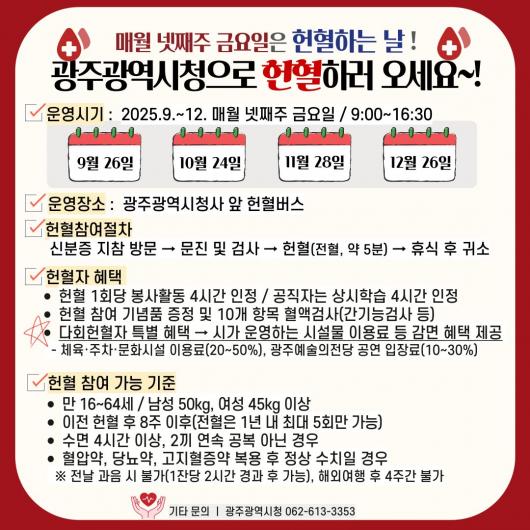 ±¤Áֽô ¿ÃÇØ 9¿ùºÎÅÍ 12¿ù±îÁö ¸Å¿ù ³Ý° ÁÖ ±Ý¿äÀÏÀ» ¡®ÇåÇ÷ Âü¿©ÀÇ ³¯¡¯·Î Á¤Çϰí, ´ëÇÑÀû½ÊÀÚ»ç ±¤ÁÖ¡¤Àü³²Ç÷¾×¿ø°ú Çù·ÂÇØ ¿ÀÀü 9½ÃºÎÅÍ ¿ÀÈÄ 4½Ã30ºÐ±îÁö û»ç ¾Õ ½Ã¹Î±¤Àå¿¡ ÇåÇ÷¹ö½º¸¦ ¹èÄ¡¡¤¿î¿µÇÑ´Ù.