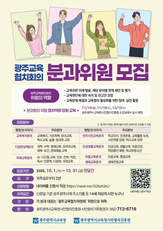 ±¤Áֽñ³À°Ã», ±¤ÁÖ ½Ã¹ÎÇùÄ¡ÁøÈï¿ø ±¤ÁÖ±³À°ÇùġȸÀÇ ºÐ°úÀ§¿ø °ø¸ð - 2±â 100¿© ¸í¡¦±³À°º¹Áö µî 7°³ ºÐ°ú 26°³ ºÐ¾ß ¾ÆÄ§½Å¹® mornnews@hanmail.net |
