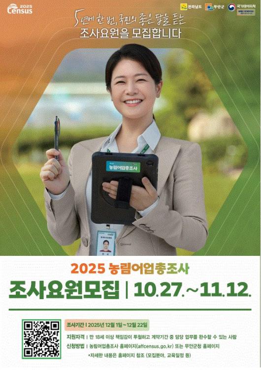 [¹«¾È/»çȸ]¹®±Ù¹Ì ±âÀÚ = Àü³² ¹«¾È±º(±º¼ö ±è»ê)Àº ¿À´Â 11¿ù 20ÀϺÎÅÍ 12¿ù 22ÀϱîÁö ½Ç½ÃµÇ´Â¡¸2025 ³ó¸²¾î¾÷ÃÑÁ¶»ç¡¹ÀÇ ¿øÈ°ÇÑ ÃßÁøÀ» À§ÇØ Á¶»ç¿ä¿øÀ» ¸ðÁýÇÑ´Ù.