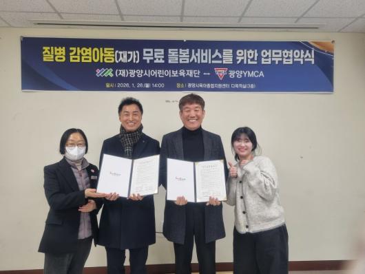 [±¤¾ç/»çȸ]Á¤¼øÀÌ ±âÀÚ = (Àç)±¤¾ç½Ã¾î¸°À̺¸À°Àç´ÜÀº 1¿ù 26ÀÏ ±¤¾ç½ÃÀ°¾ÆÁ¾ÇÕÁö¿ø¼¾ÅÍ ´Ù¸ñÀû½Ç¿¡¼ ±¤¾çYMCA¿Í ¡¸Áúº´ °¨¿°¾Æµ¿(Àç°¡) ¹«·áµ¹º½ ¼ºñ½º Áö¿ø»ç¾÷¡¹ ÃßÁøÀ» À§ÇÑ ¾÷¹«Çù¾àÀ» ü°áÇß´Ù°í ¹àÇû´Ù.