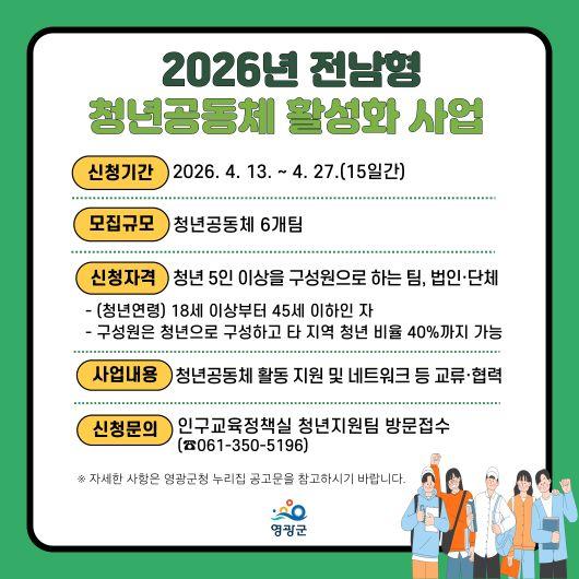 | ¿µ±¤±º, ¡®2026³â Àü³²Çü û³â°øµ¿Ã¼ Ȱ¼ºÈ »ç¾÷¡¯Âü¿©ÆÀ ¸ðÁý ¾ÆÄ§½Å¹® mornnews@hanmail.net |
