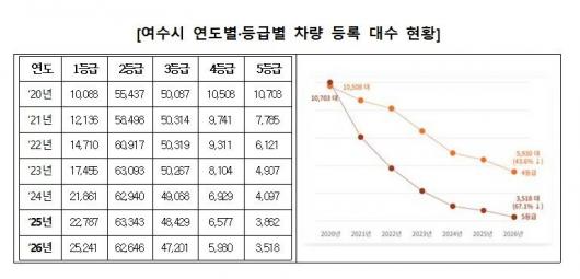 [¿©¼ö/»çȸ]Àå¼÷Èñ ±âÀÚ = ¿©¼ö½Ã´Â ¡®2026³âµµ ³ëÈÄÂ÷ Á¶±âÆóÂ÷ Áö¿ø»ç¾÷¡¯ ´ë»óÀÚ ¼±Á¤À» ¿Ï·áÇÏ°í ¹èÃâ°¡½º 4¡¤5µî±Þ Â÷·® °¨Ãà¿¡ ¼Óµµ¸¦ ³»°í ÀÖ´Ù°í ¹àÇû´Ù.
